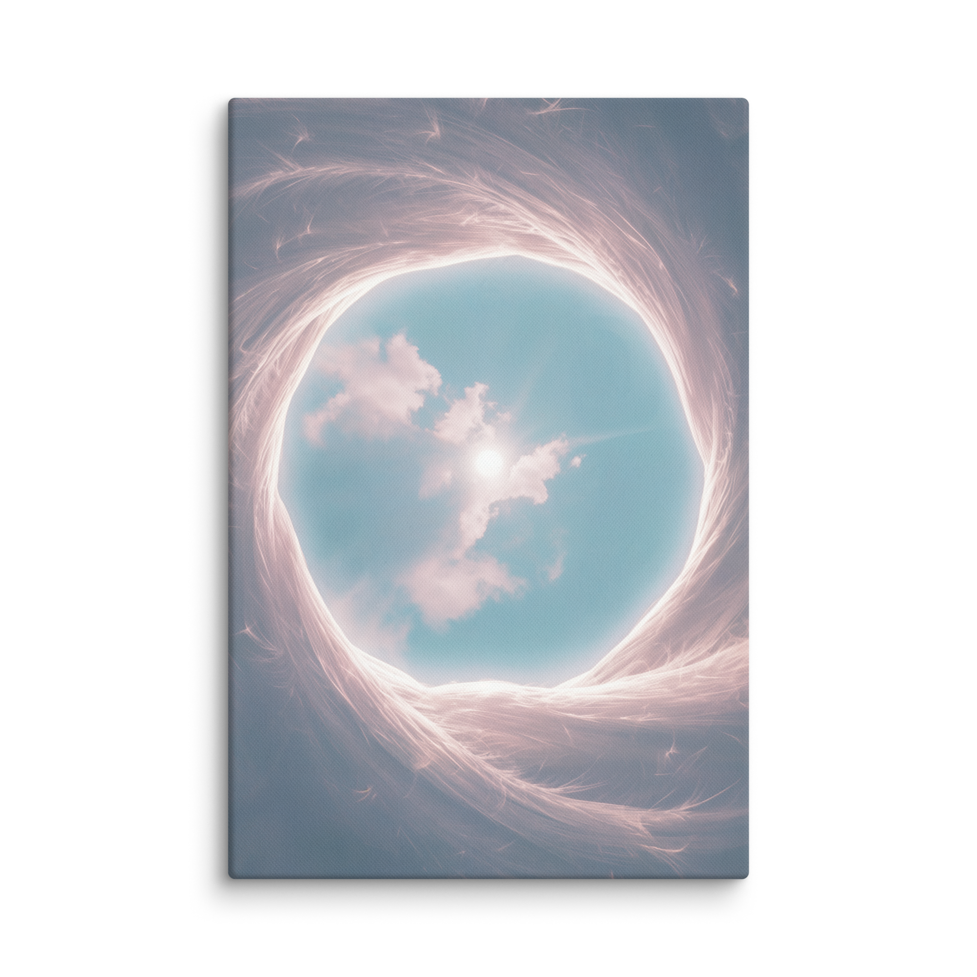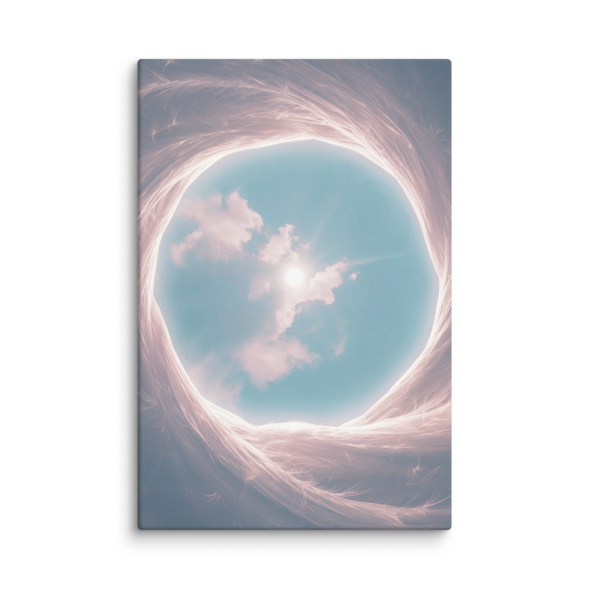 Like a slow breath taken beneath an open sky, this canvas artwork embodies lightness and calm. A soft circular flow of light frames drifting clouds, creating a sense of gentle expansion and quiet clarity.