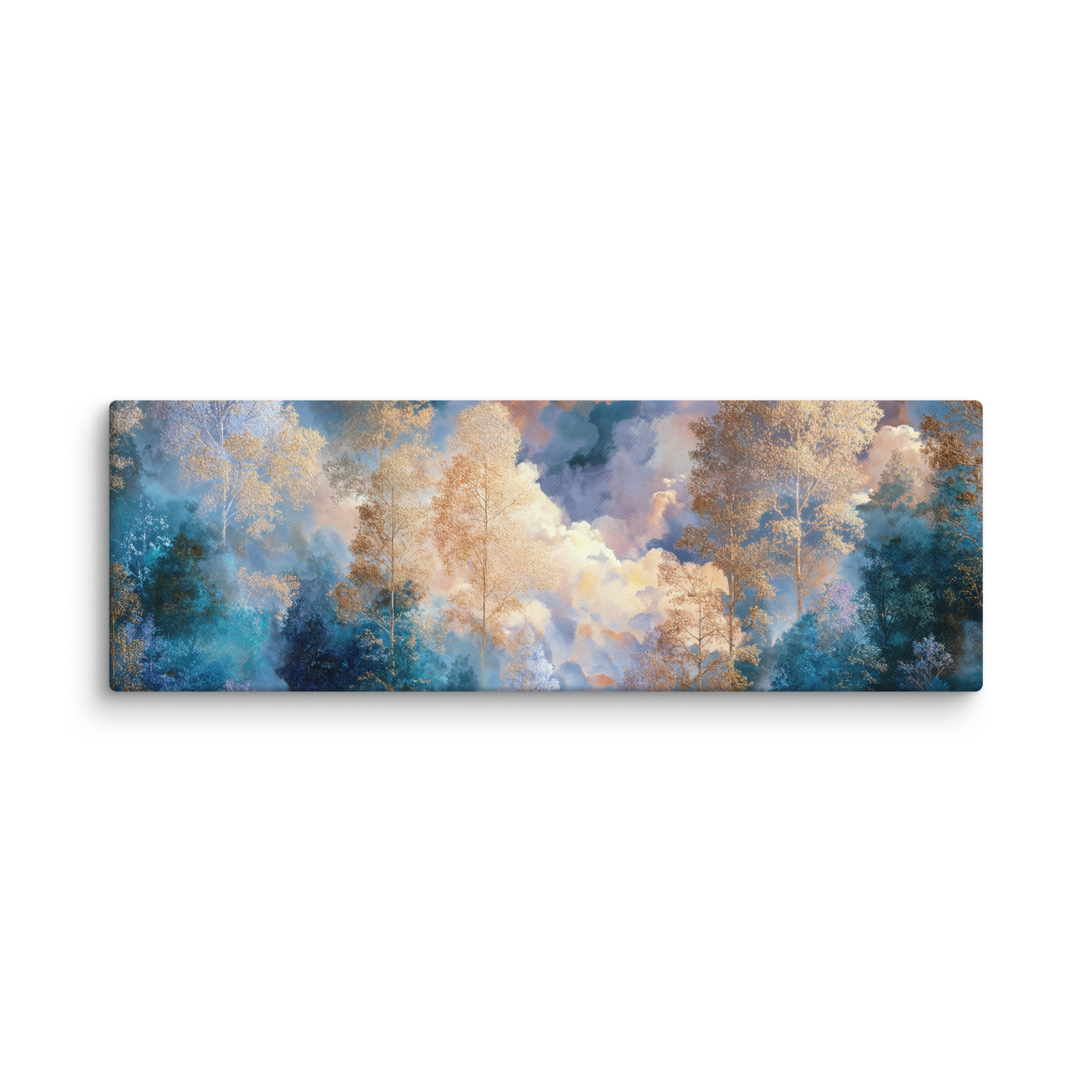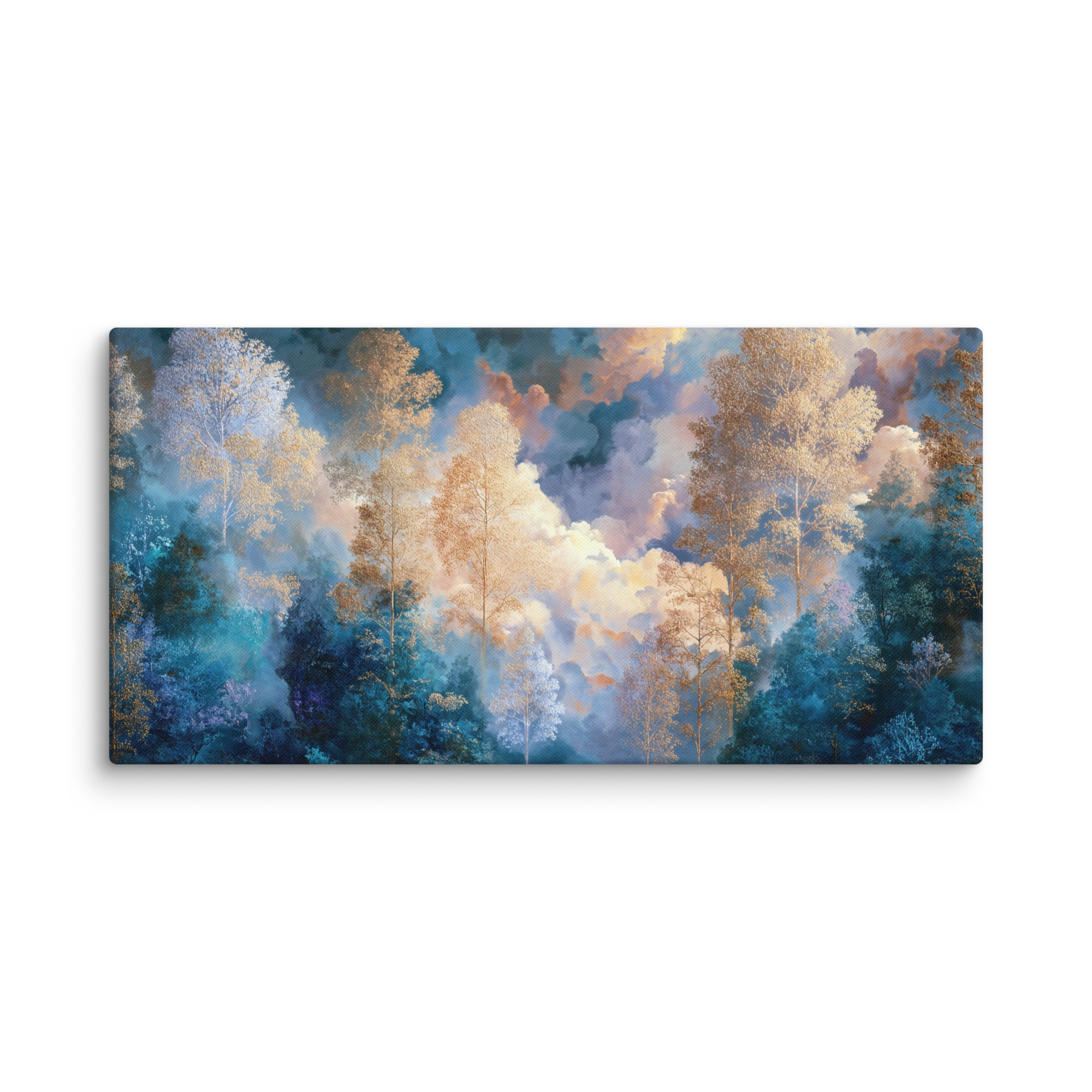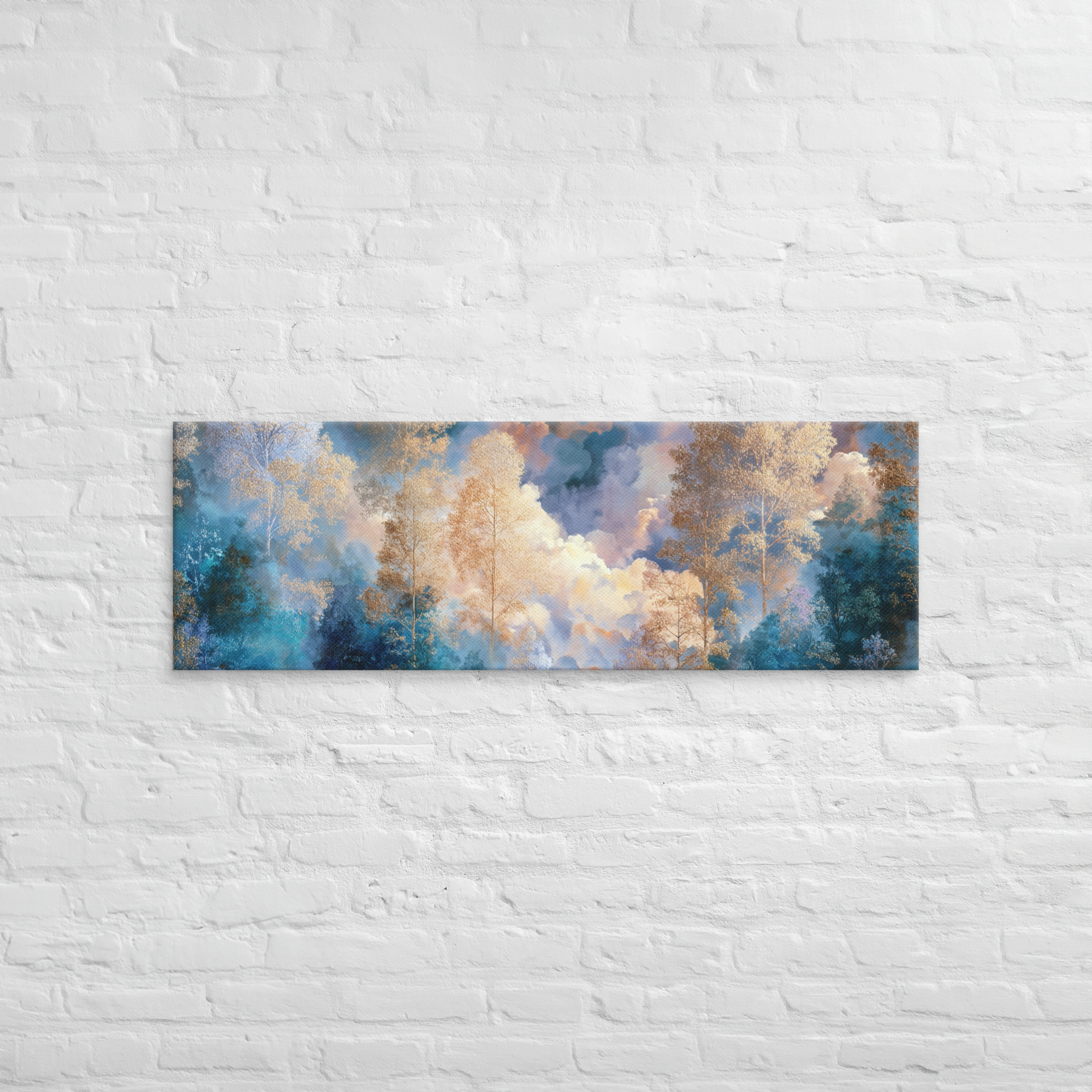 Soft golden trees rise through layers of misty blue and celestial clouds, creating a tranquil balance between nature’s warmth and the dreamlike calm of the sky. Every detail of this canvas radiates serenity — perfect for bringing peace and harmony into your home or creative studio.