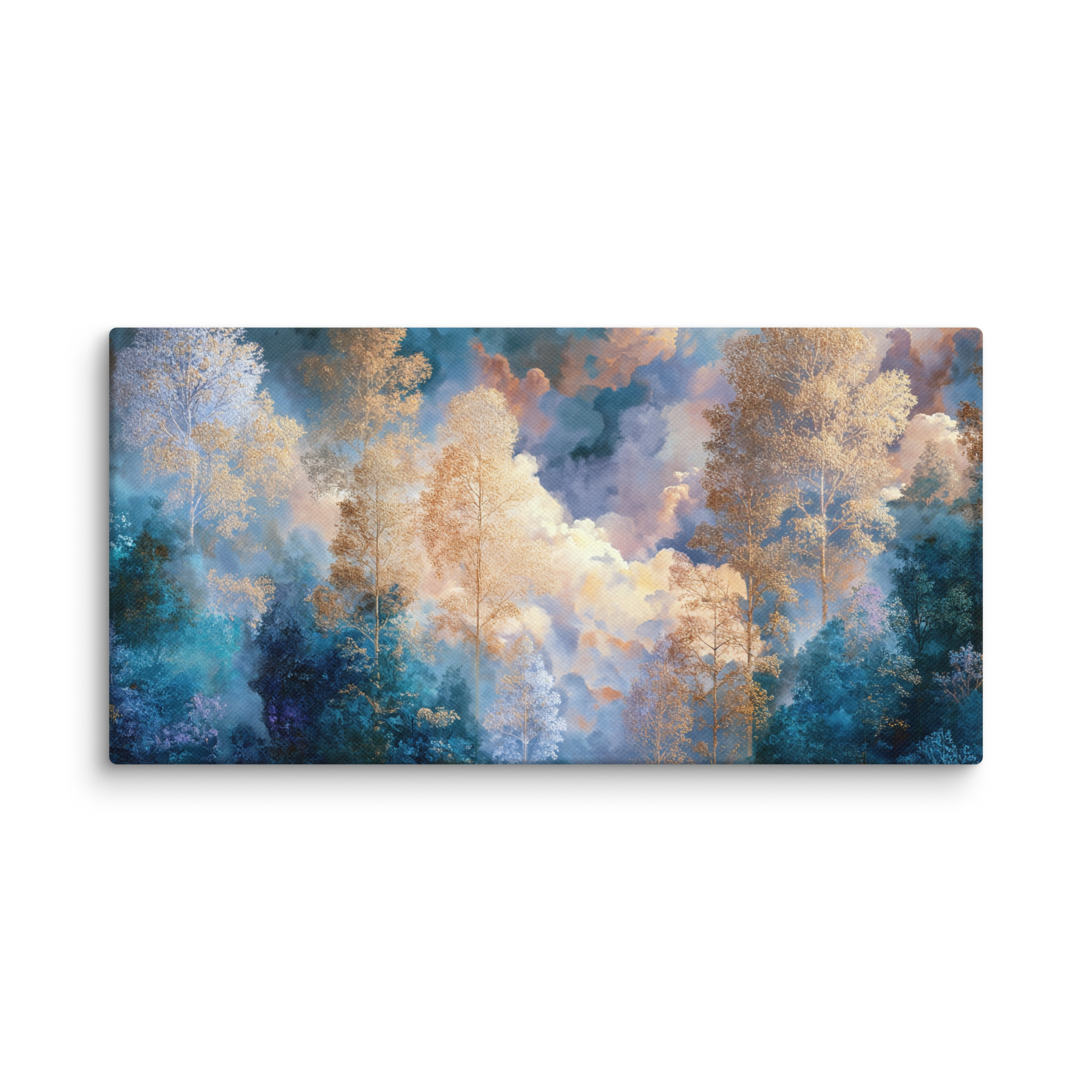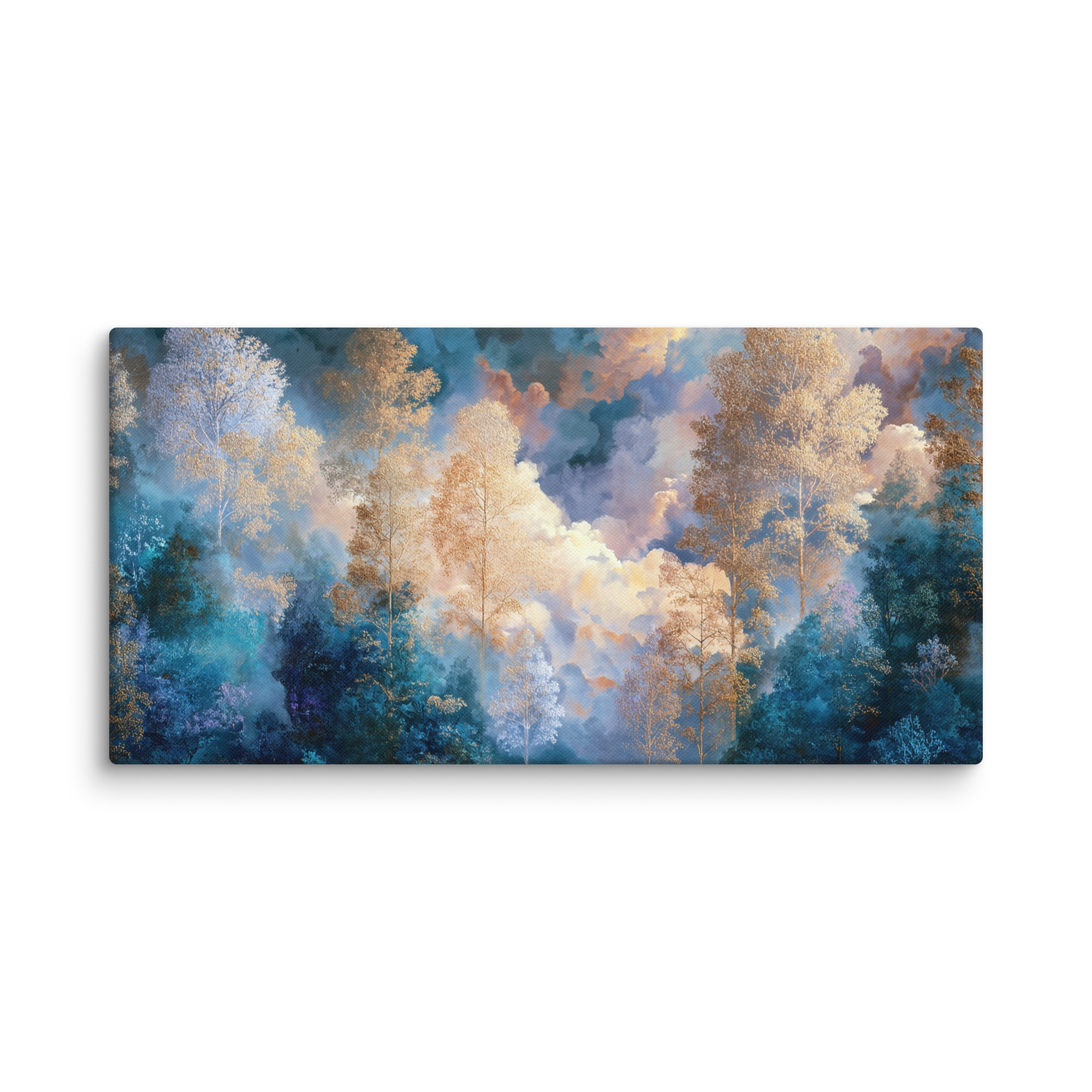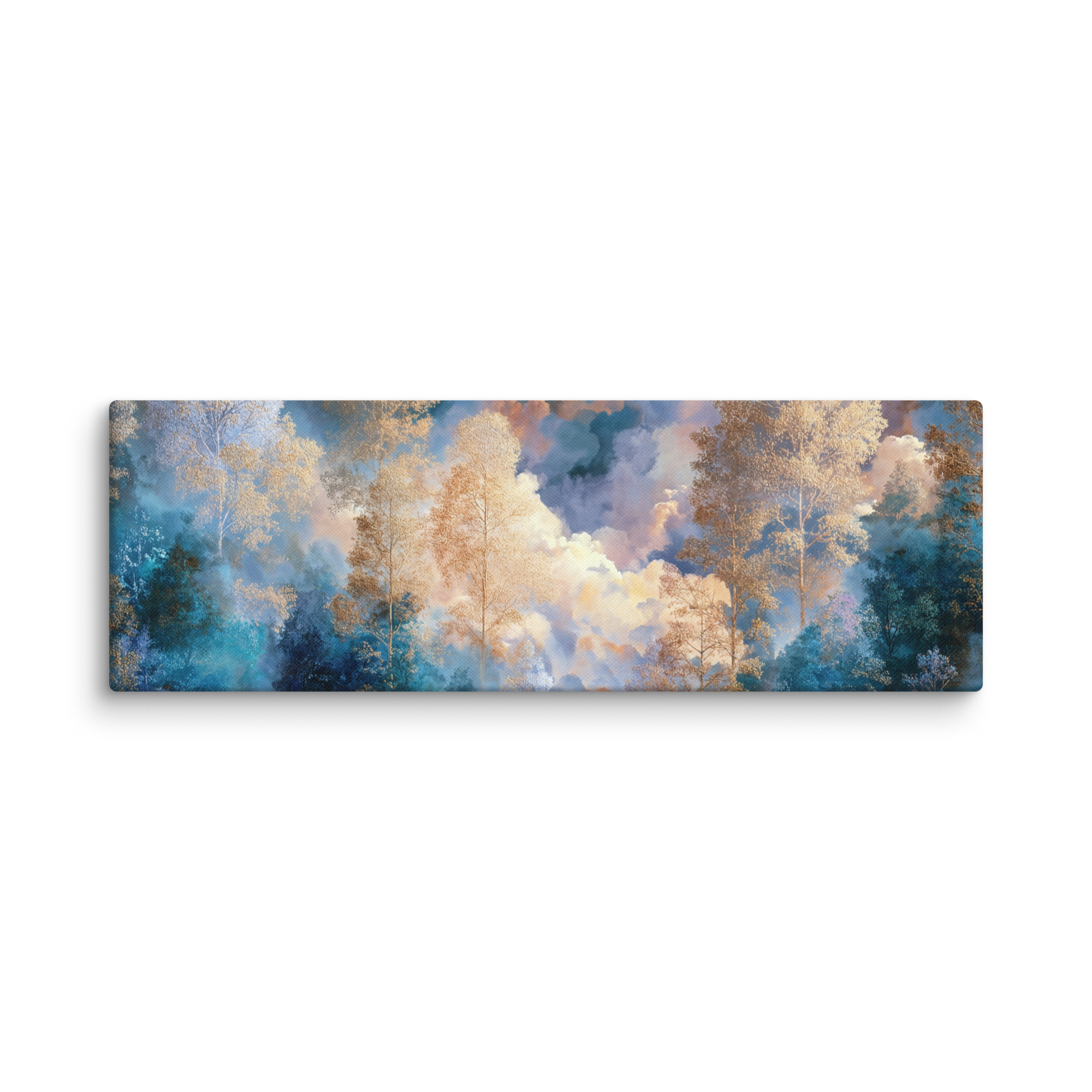 Soft golden trees rise through layers of misty blue and celestial clouds, creating a tranquil balance between nature’s warmth and the dreamlike calm of the sky. Every detail of this canvas radiates serenity — perfect for bringing peace and harmony into your home or creative studio.