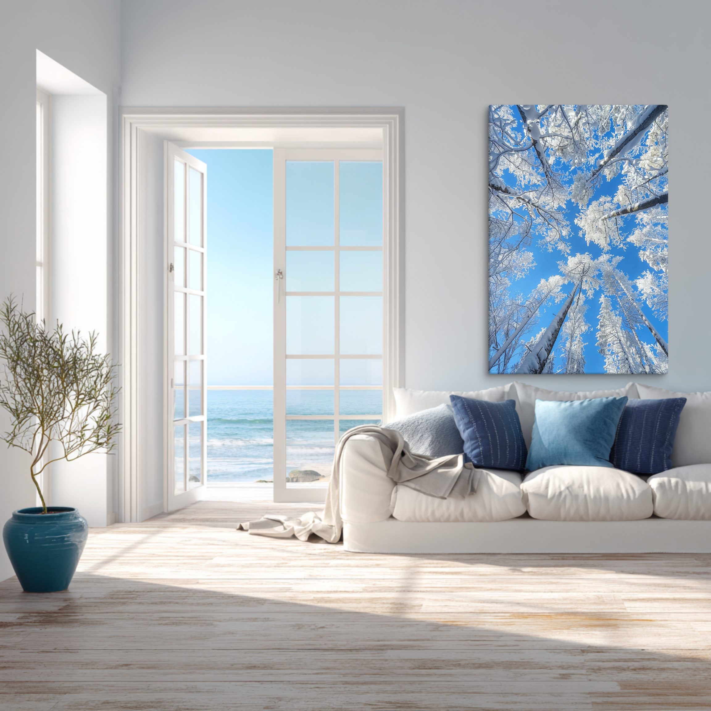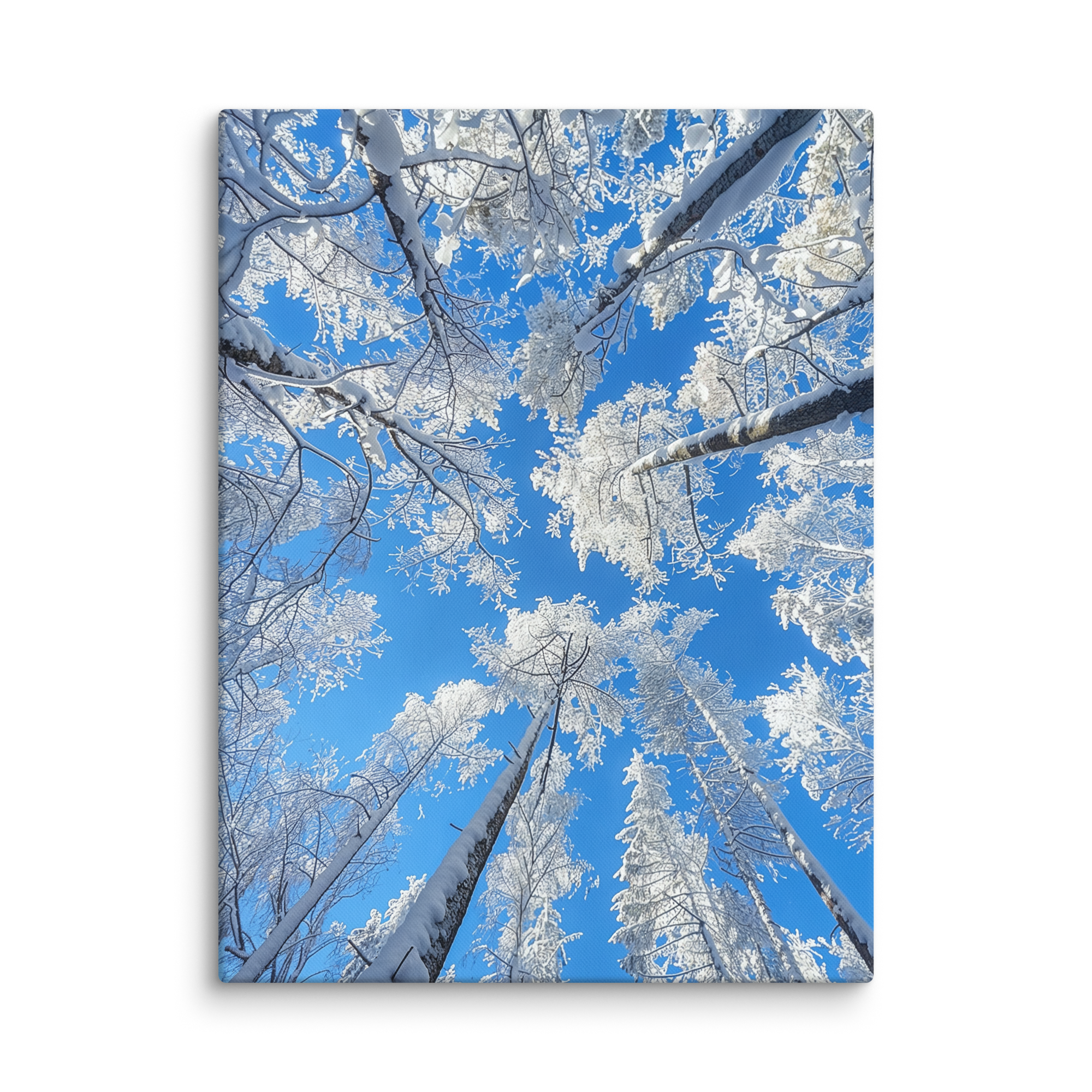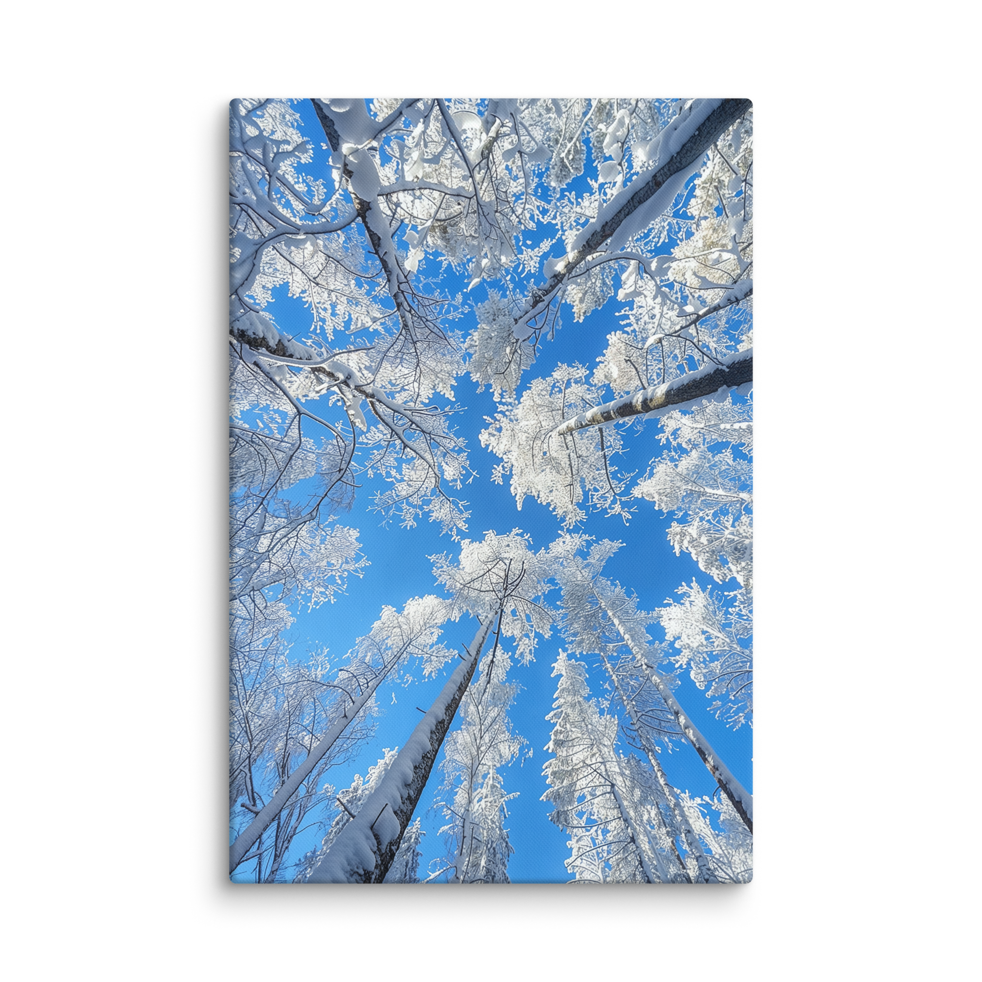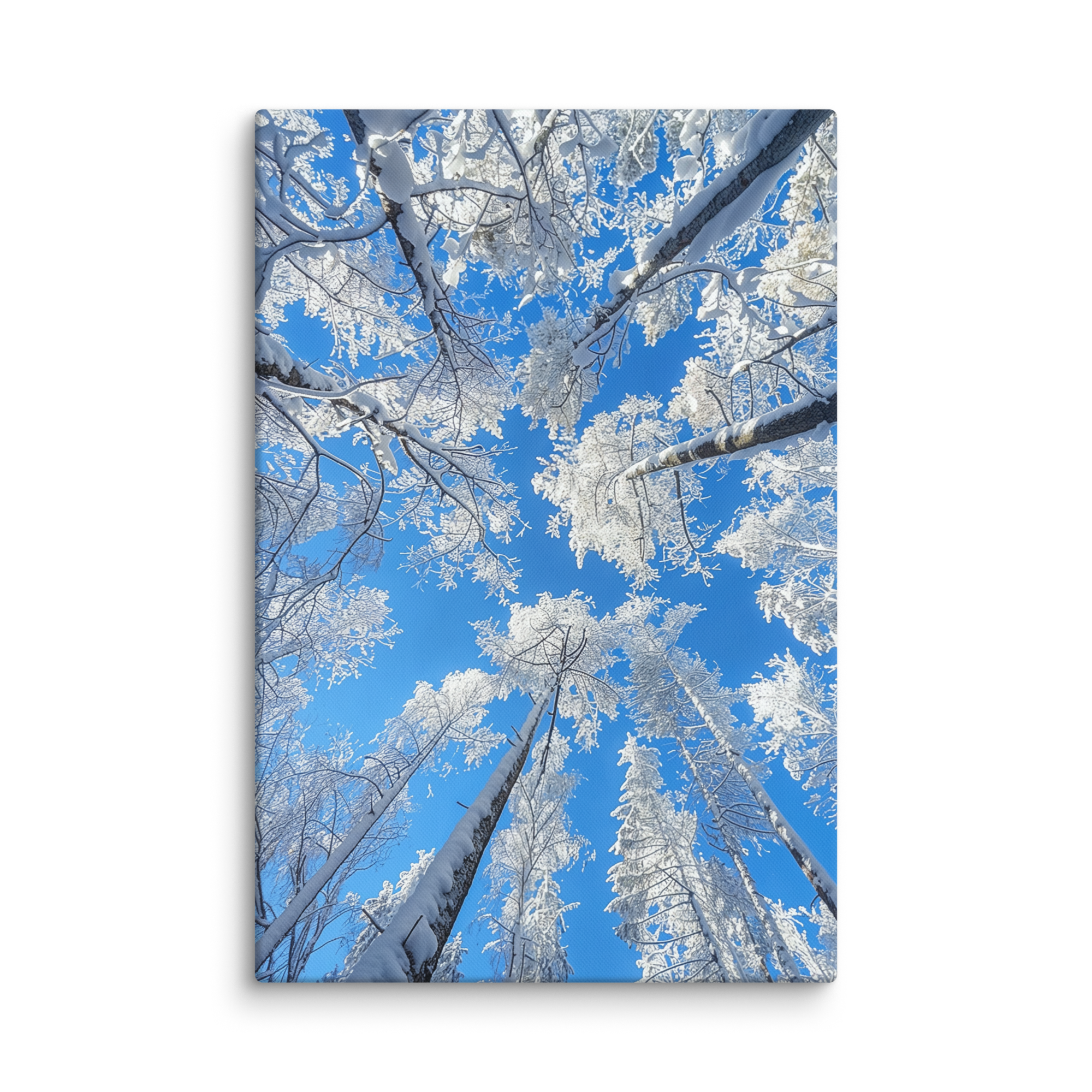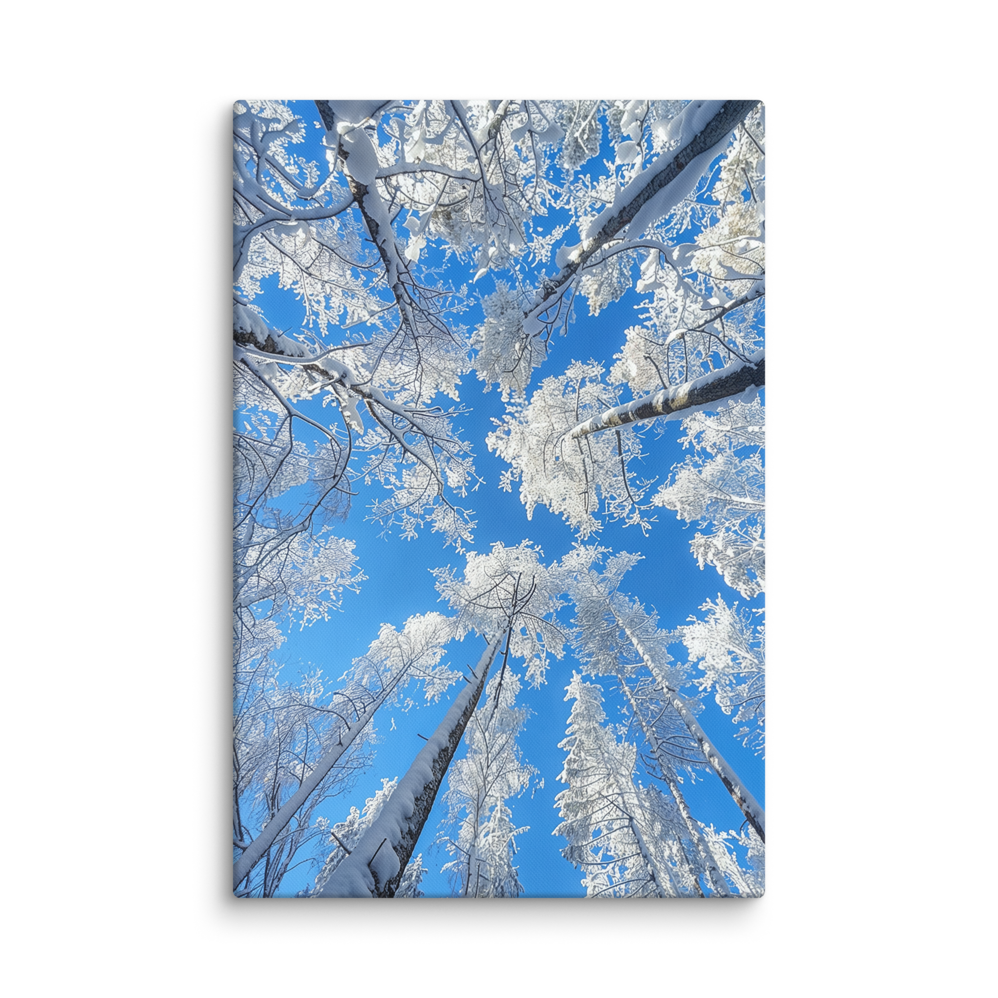 Transform your wall into a window to the sky with this breathtaking canvas print. Seen from below, snow-laden trees stretch upward like delicate sculptures, framing a deep, cloudless blue sky. The composition invites you to pause, breathe deeply, and feel as if you are standing in a quiet winter forest, gazing up into infinity. A perfect centerpiece for creating a serene, airy atmosphere in your home or office.