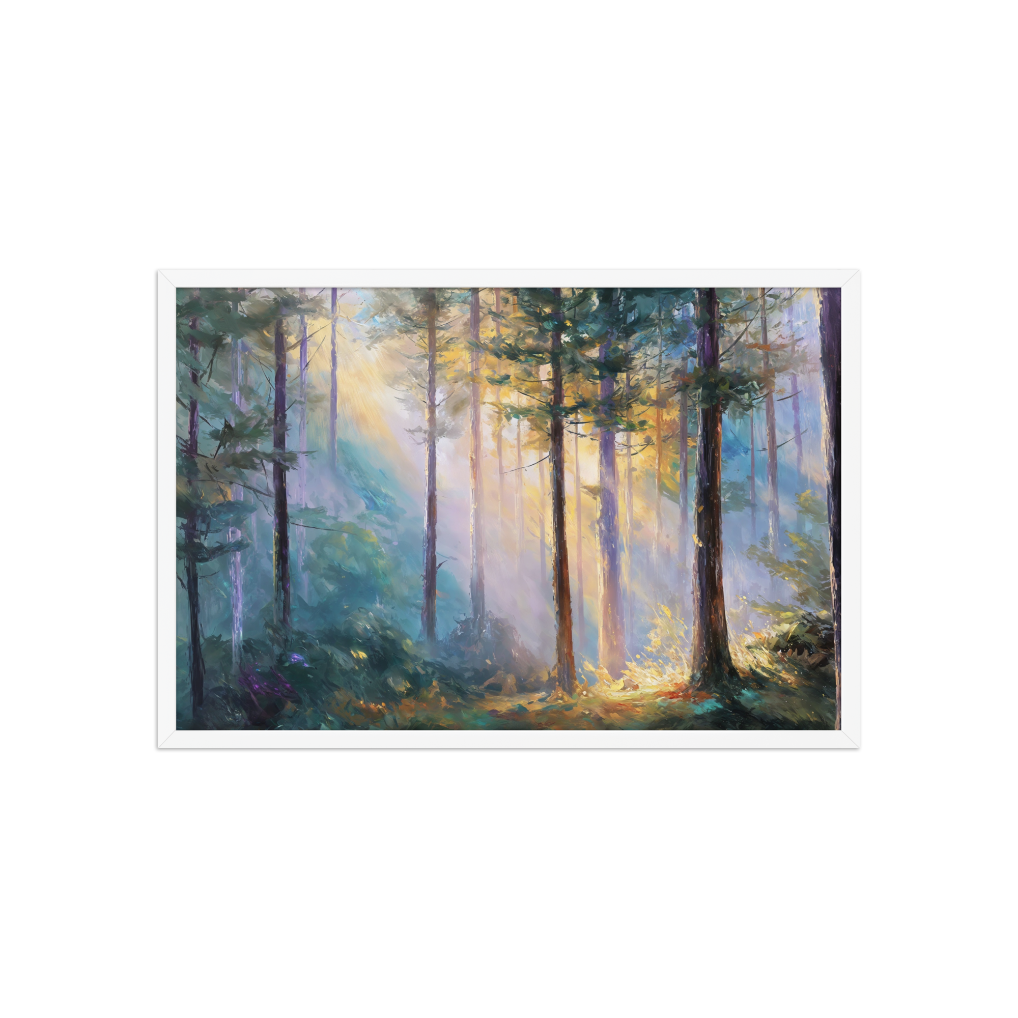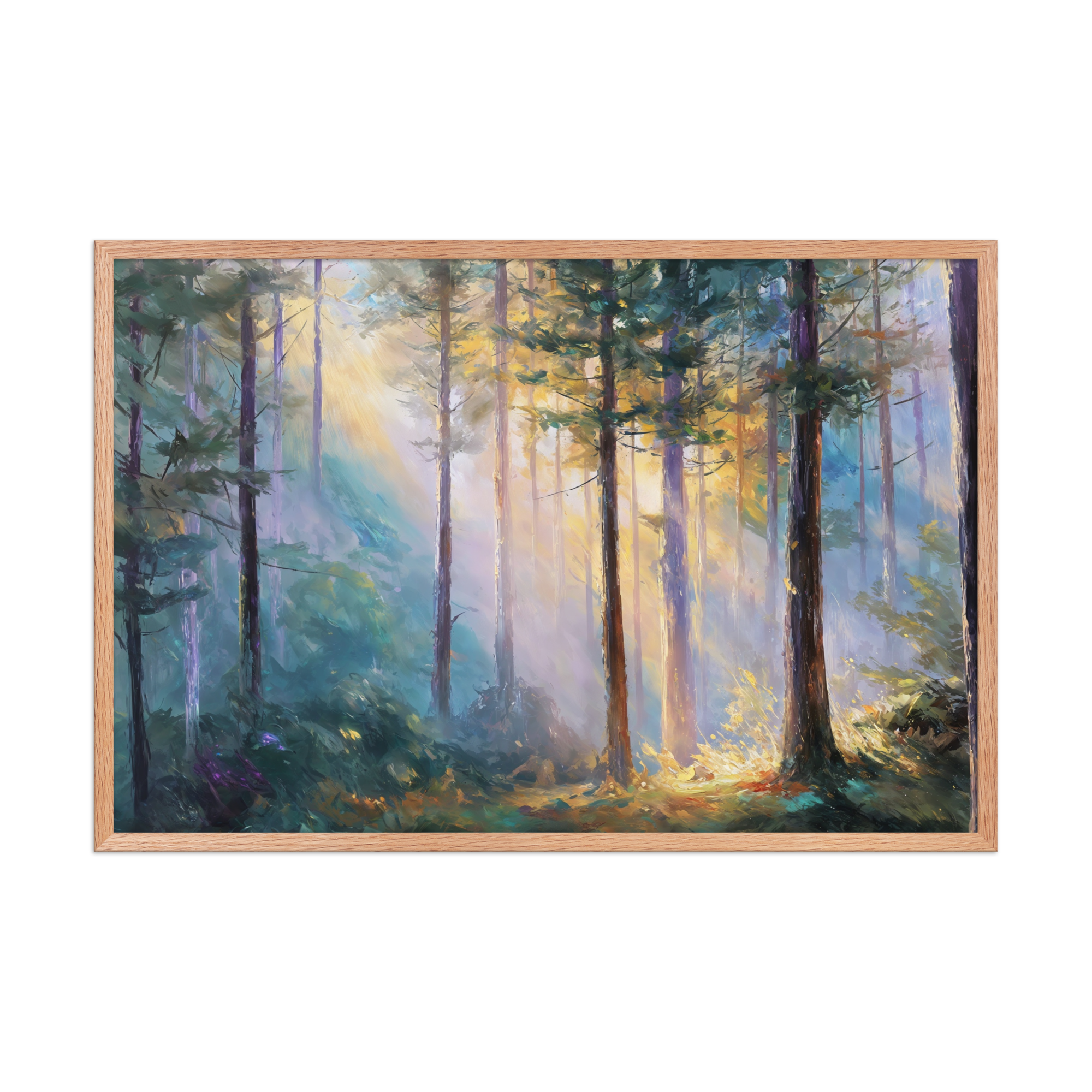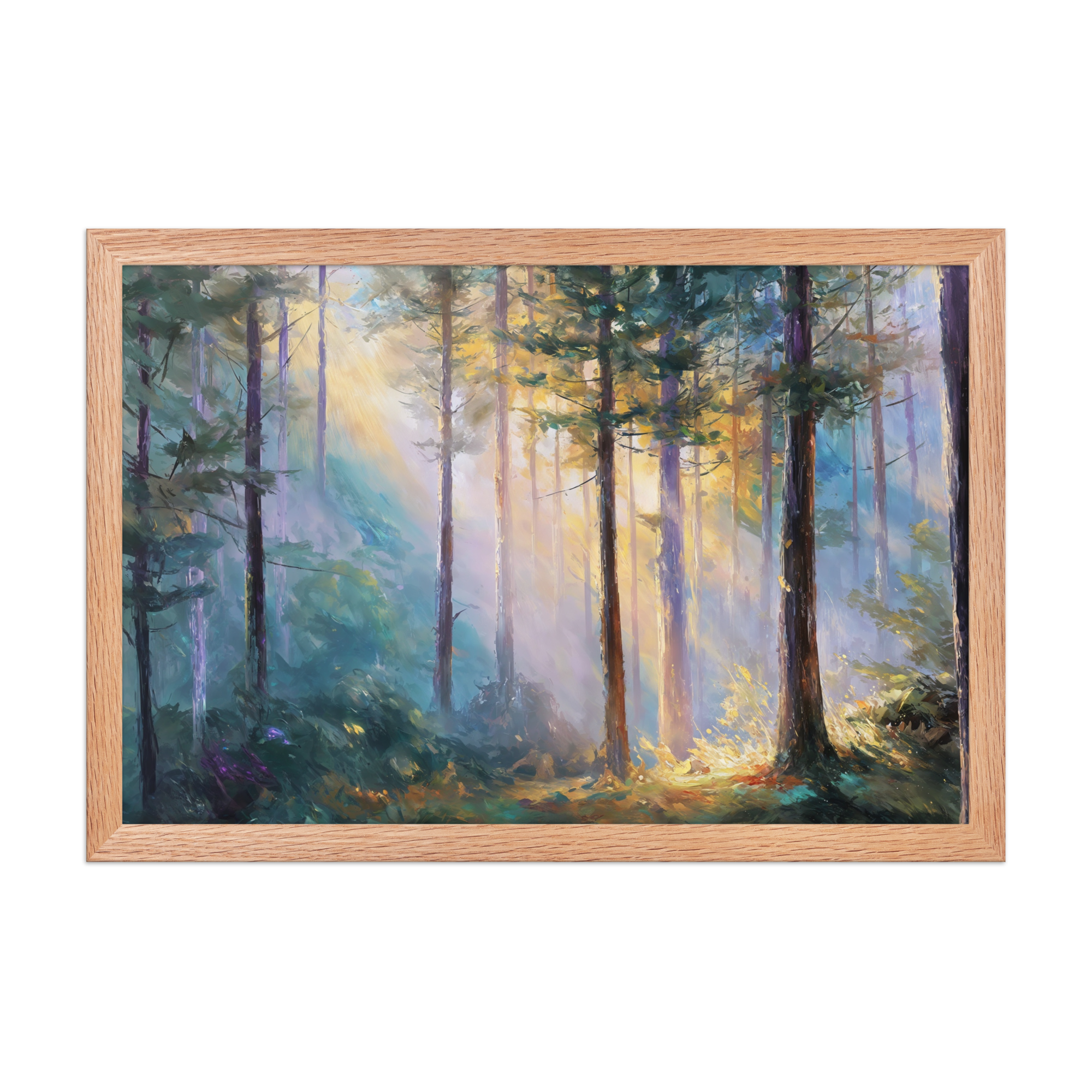 Bring the serenity of dawn into your home with this Morning Light in the Forest Framed Poster. Sunlight gently filters... Read more