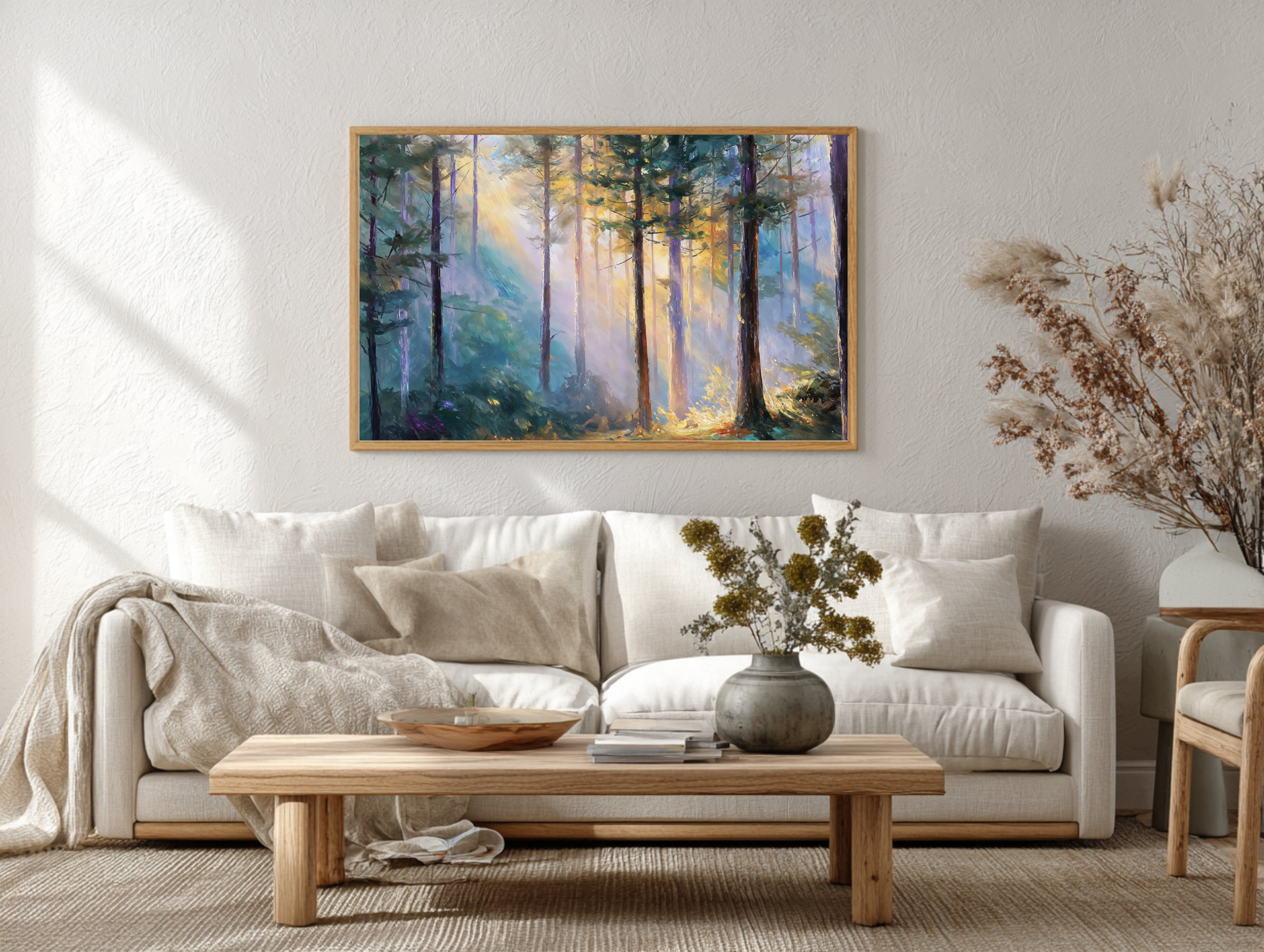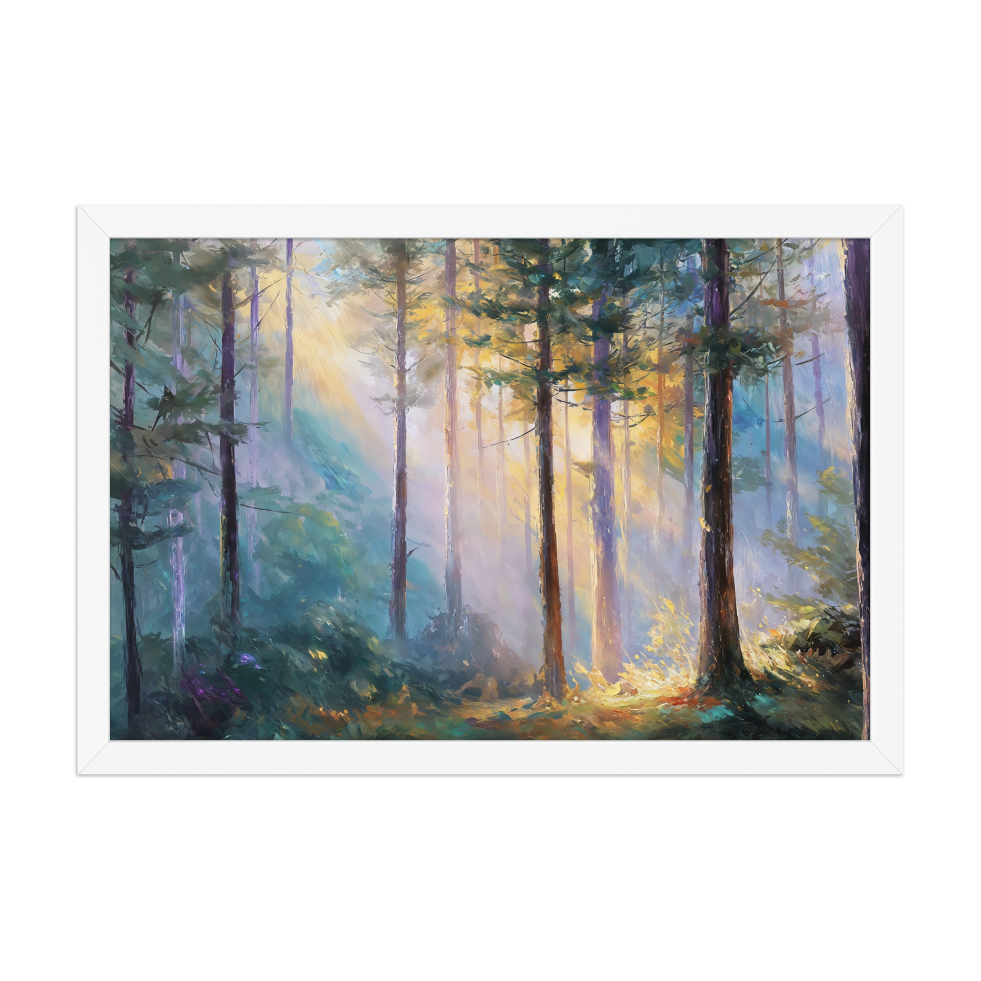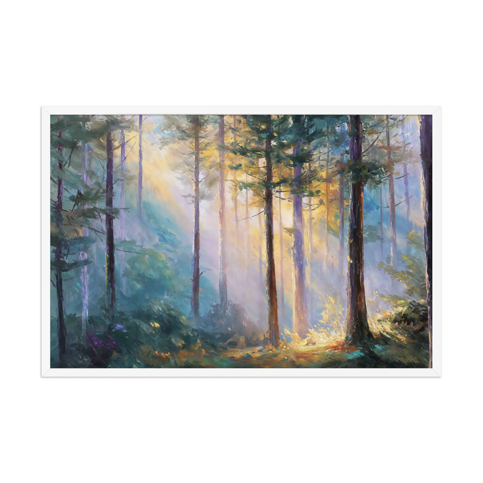 Bring the serenity of dawn into your home with this Morning Light in the Forest Framed Poster. Sunlight gently filters... Read more