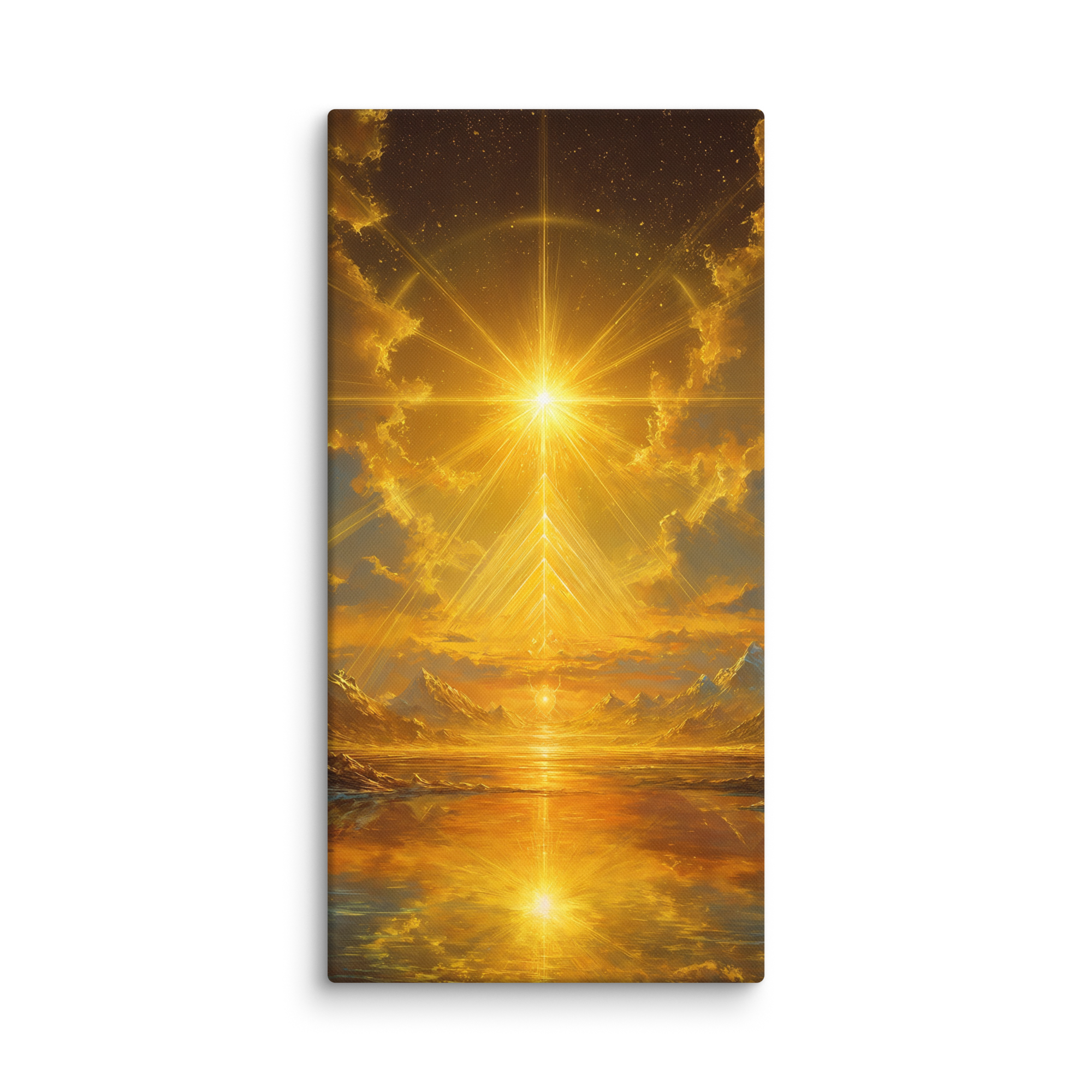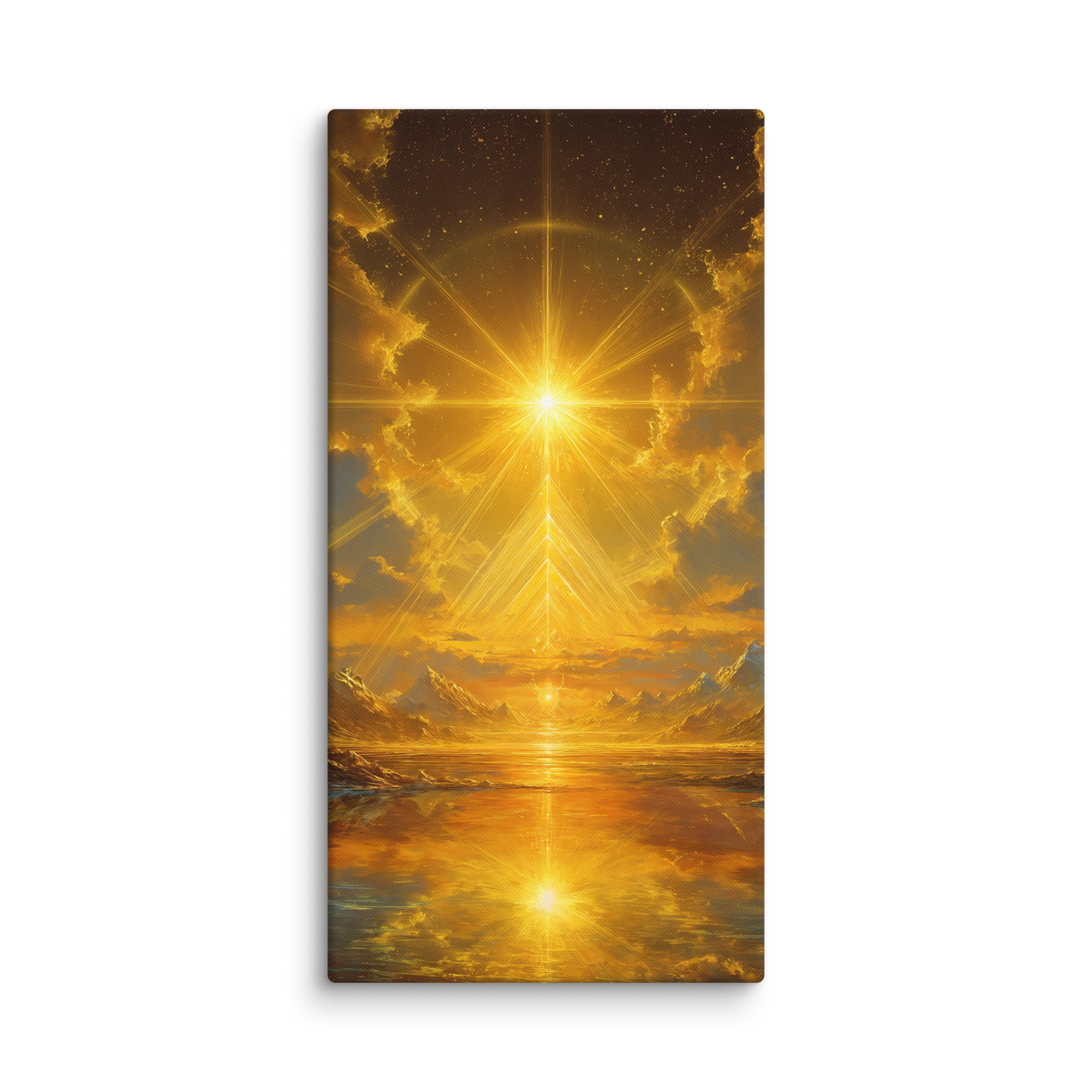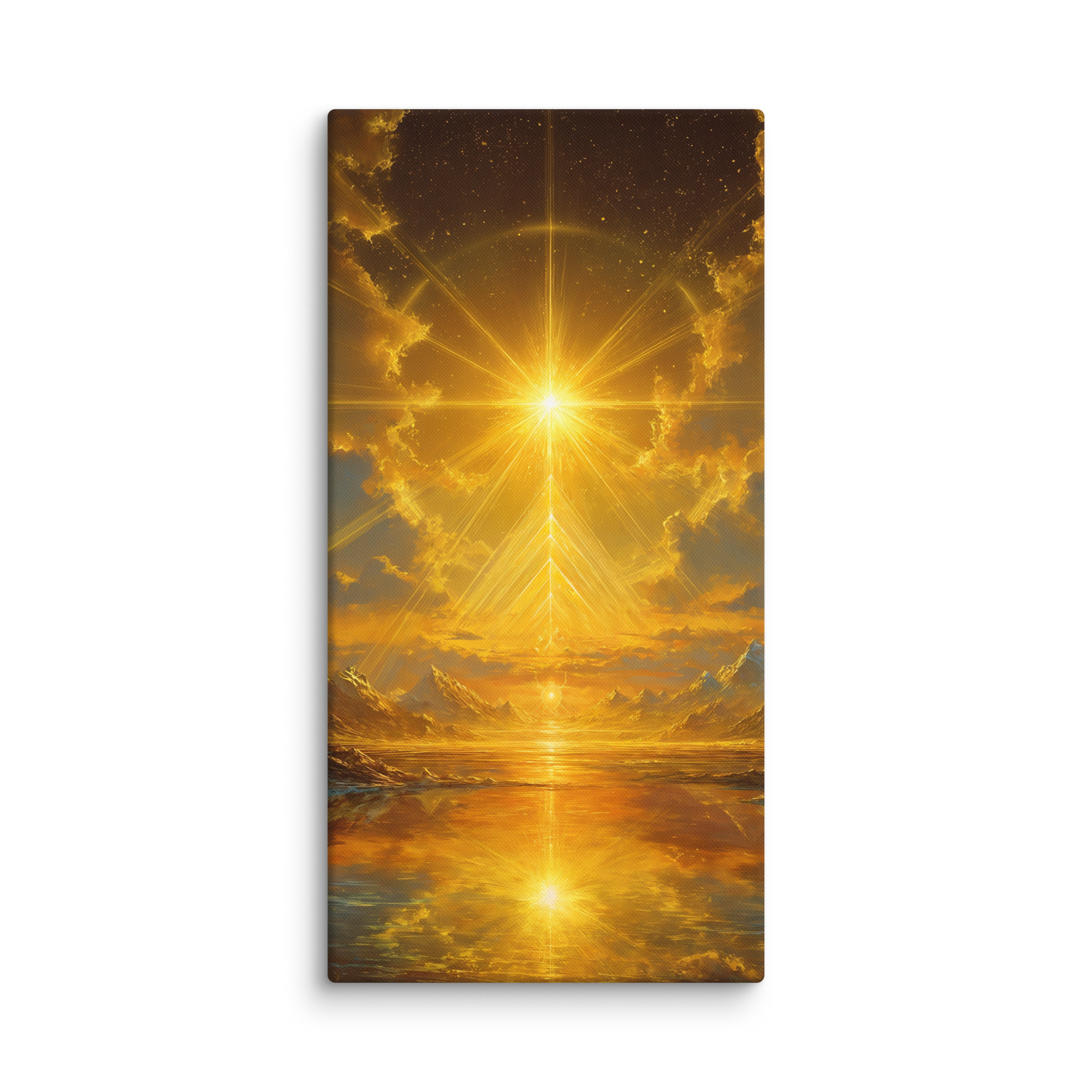 Hand-stretched on premium poly-cotton canvas, the print retains a deep luminous quality — a lasting symbol of illumination and balance.